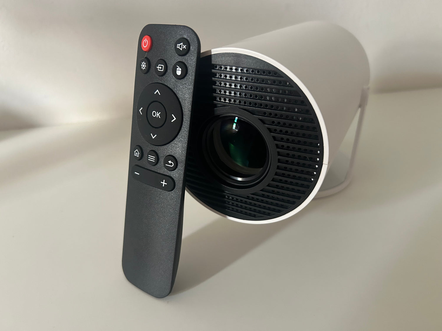 Para una experiencia completa, incorpora un altavoz de alta calidad que proporciona un audio claro y potente, suficiente para espacios pequeños y medianos sin necesidad de sistemas externos. Además, incluye un mando a distancia que permite ajustar la configuración, navegar entre menús o controlar la reproducción de forma sencilla y cómoda desde cualquier lugar de la sala.